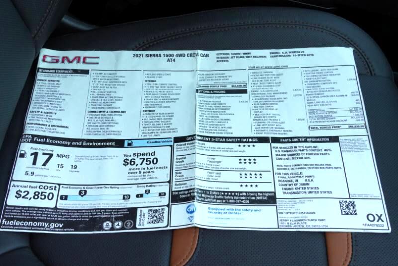 2021 GMC 1500 4wd Crew Cab with the AT4 Premium Package, 6.2L V8, Tech Package, Driver Alert II Package, Carbon Pro Package, Sunroof, 20" Carbon Grey wheels with like new Falken Wildpeak tires. Rear Kicker speaker system built into the tailgate. Over $9k in accessories including full frontal PPF from day one, color matched Century Shell with interior LED lighting, Cargo Glide rear slide in the bed, built in K40 Radar Detector, Airlift rear load leveling bags with compressor and remote. This is a one owner Oklahoma truck was meticulously cared for and I have records of every oil change from day one, every 5k miles, and 60k mile transmission oil change. Recent battery as well. Transferable engines for life program with BG. Two sets of keys, all the manuals and even the window sticker.