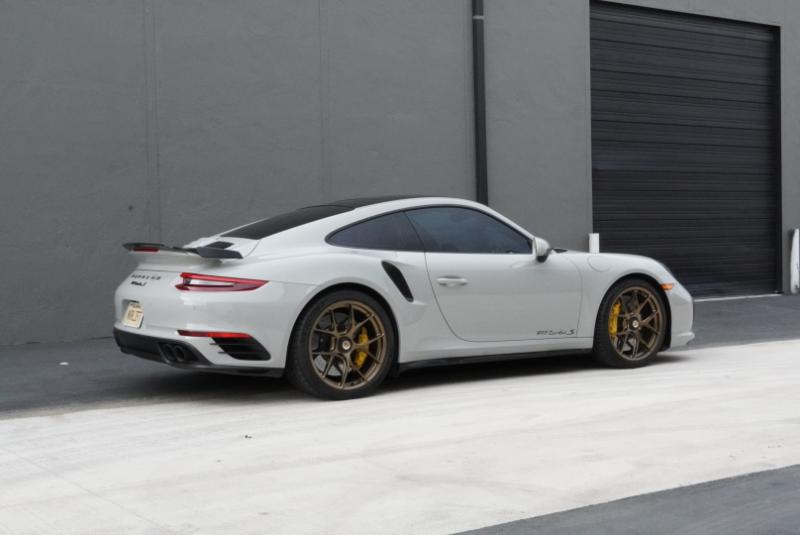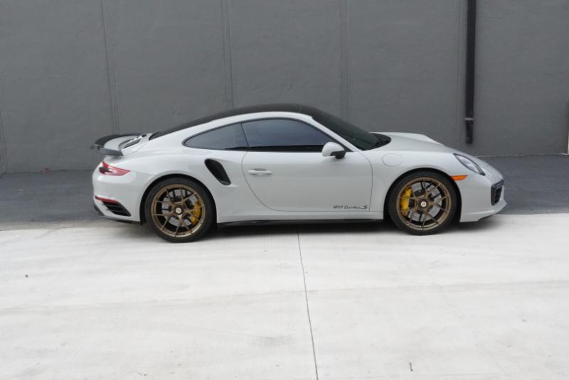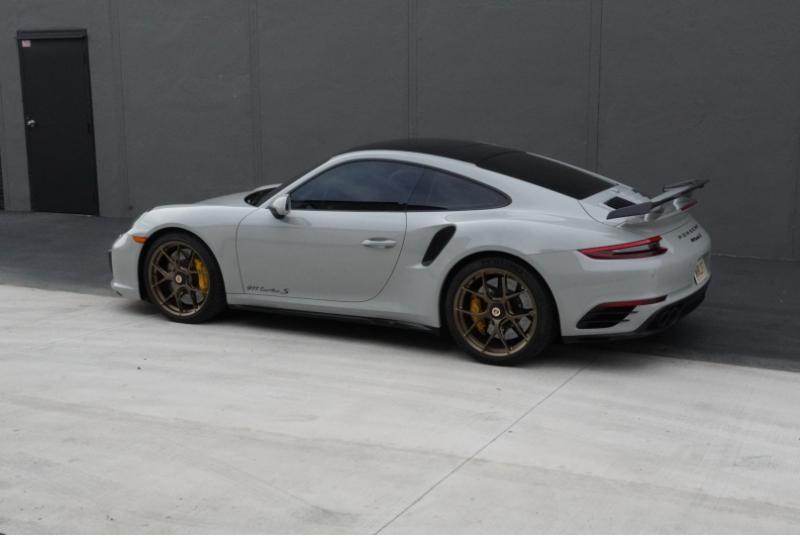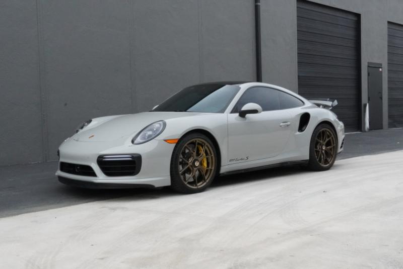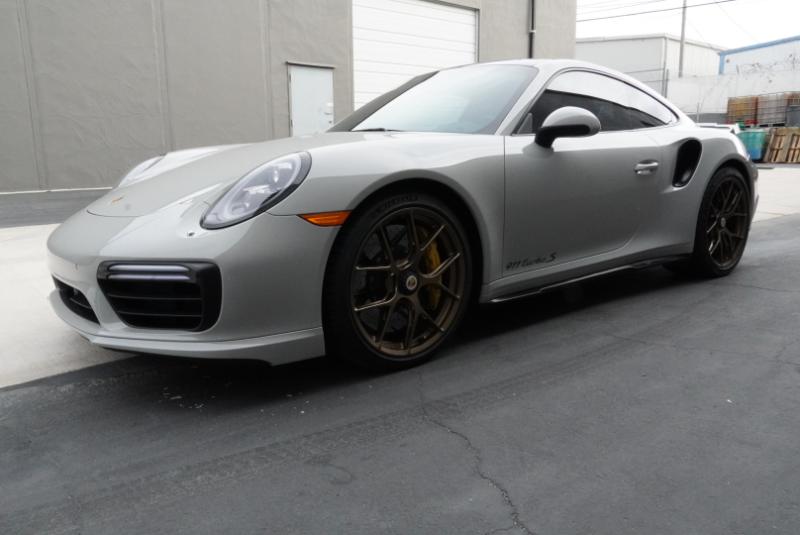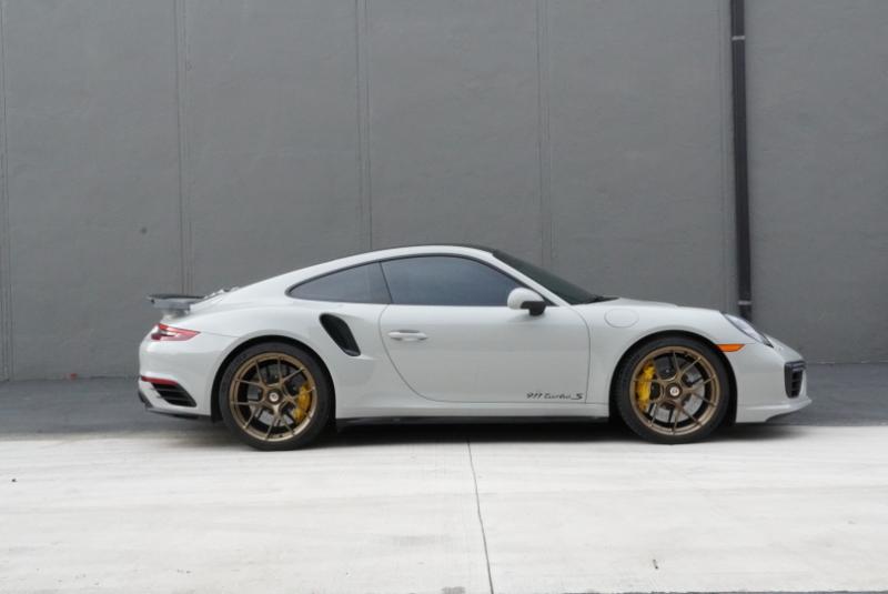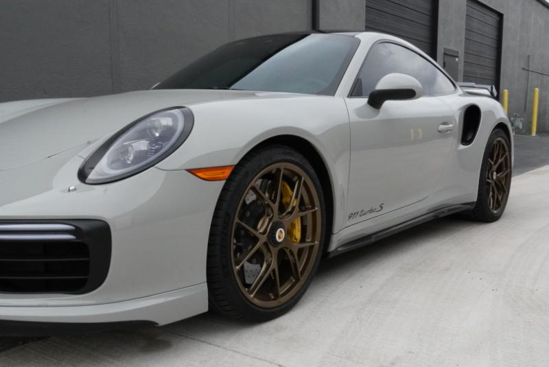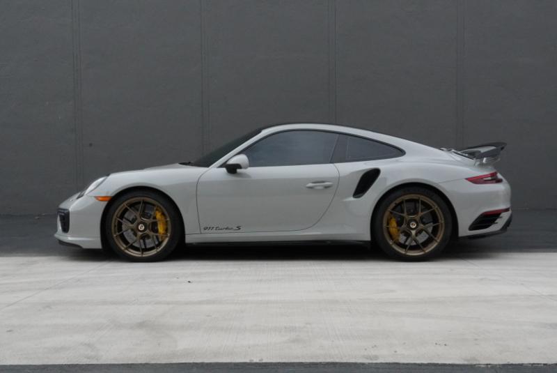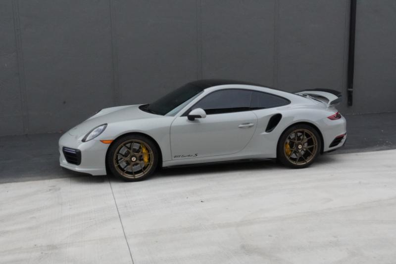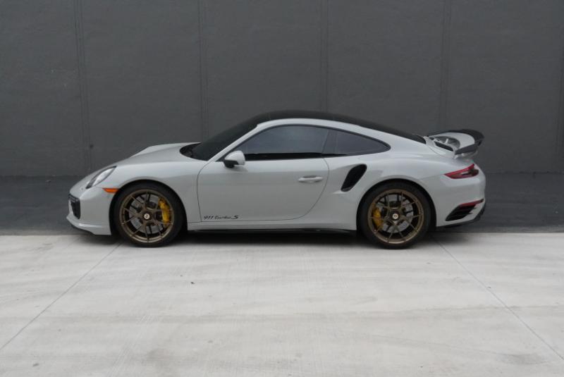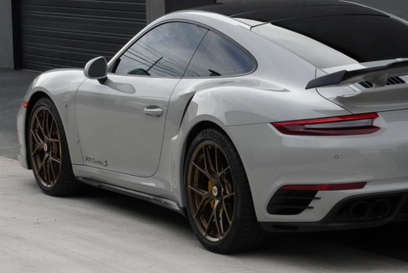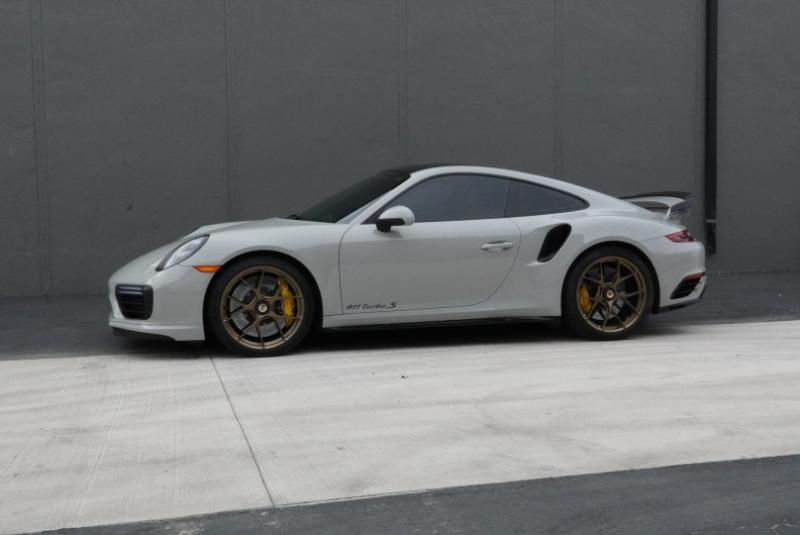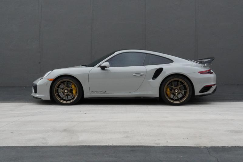 2018 Porsche 911 Turbo S, 991.2 in Chalk exterior with full front PPF over Black leather with Chalk extended deviated stitching. This Turbo S is well optioned with Carbon ceramic brakes with yellow calipers, carbon fiber interior trim, adaptive cruise control, LED headlights in Black with PLDS, 18-way adaptive front sport seats, Burmeister Surround Sound System, pedals and footrest in aluminum, rear center tunnel cover in leather, Porsche Entry and Drive, and Electric Slide and tilt sunroof. Further enhancements have been added to the car with Moshammer side skirts and rear wing, BBS FI-R EVO center lock wheels in Matte Metallic Bronze wrapped in like new Michelin Pilot Sport 4 S tires, Fabspeed Valvetronic Super Sport X-Pipe exhaust with remote and black tips (sport cat version) and hardwired for radar detection.