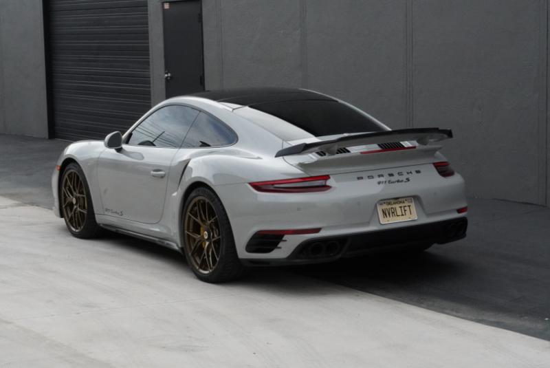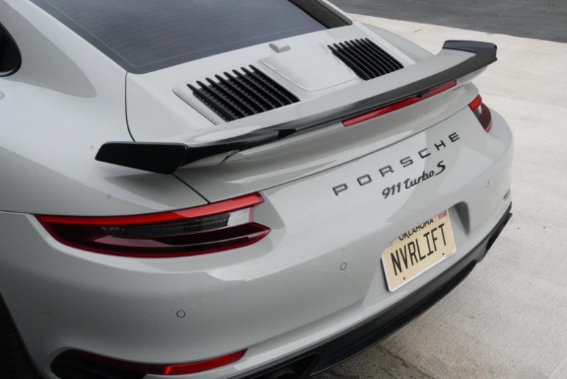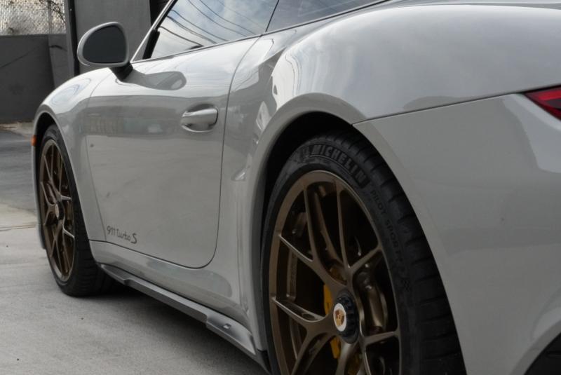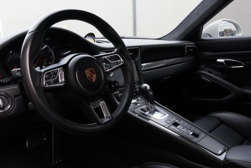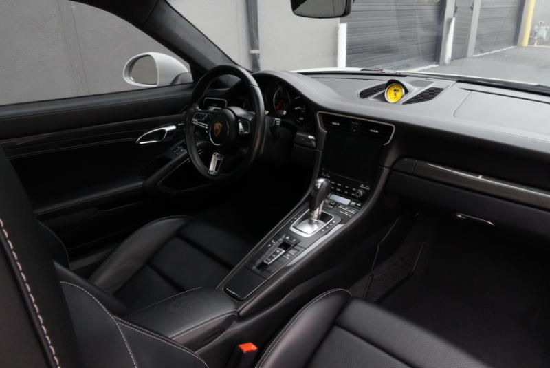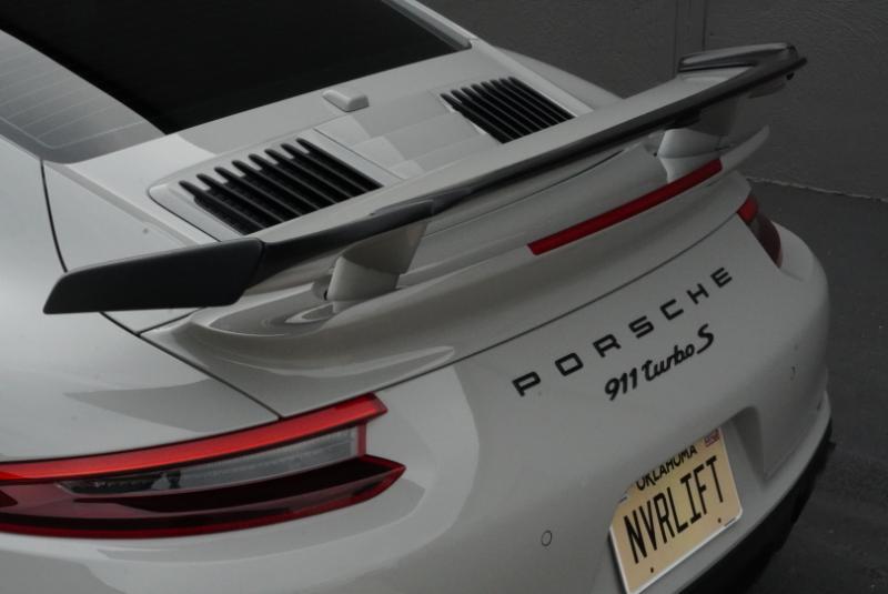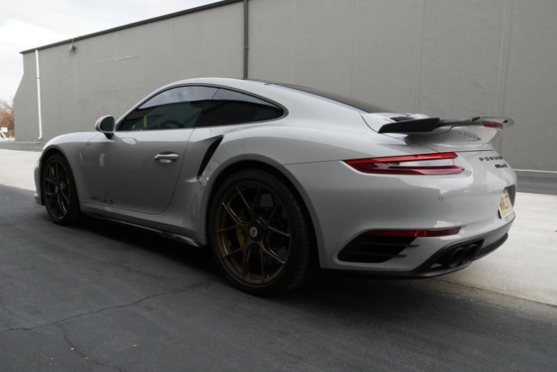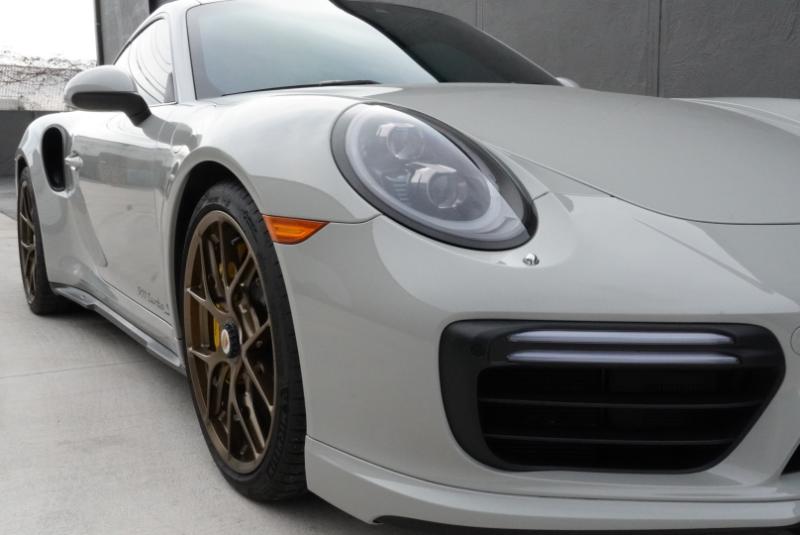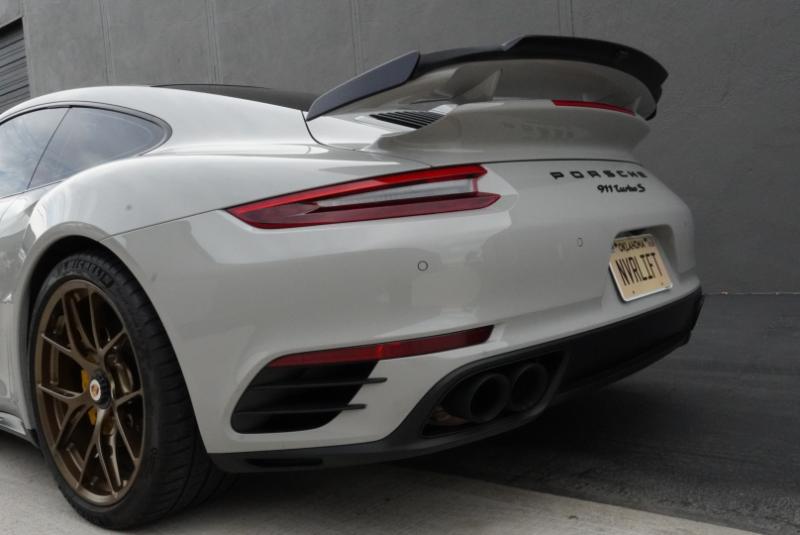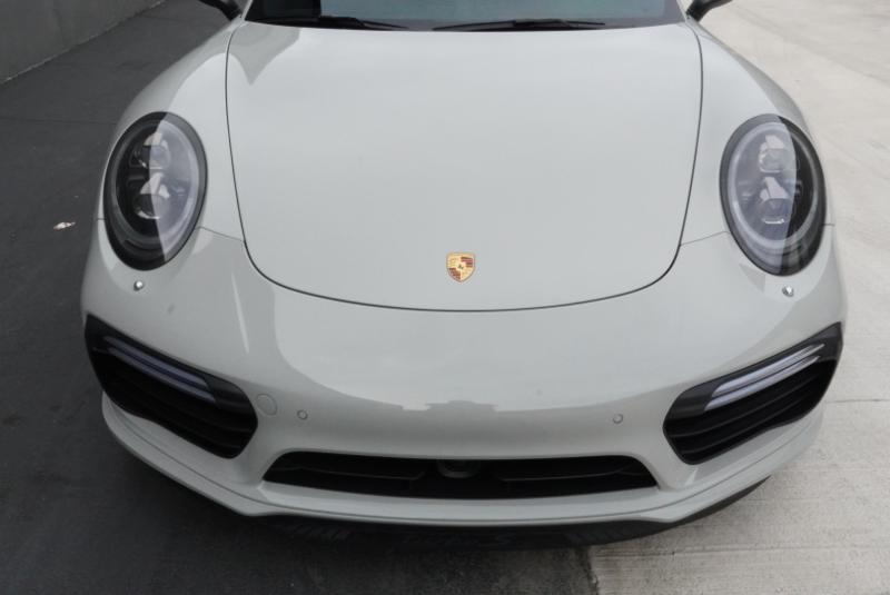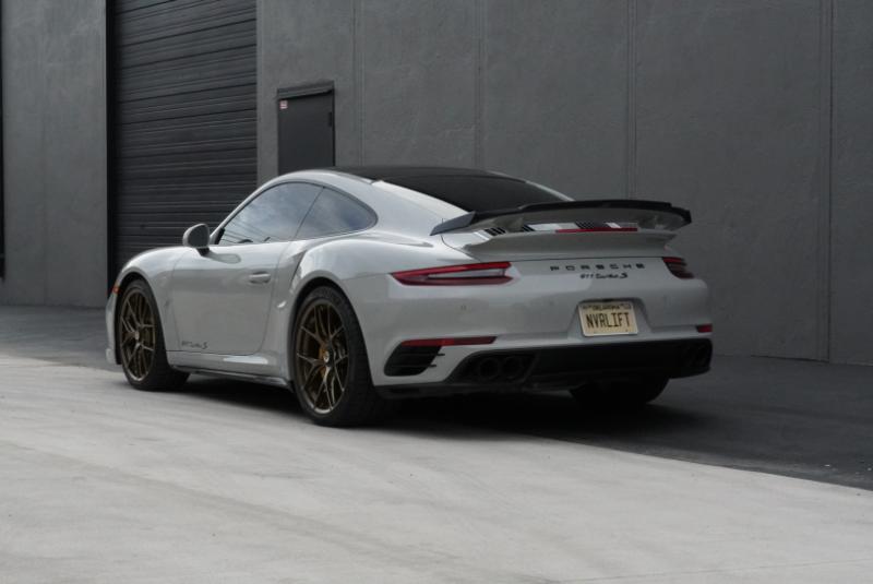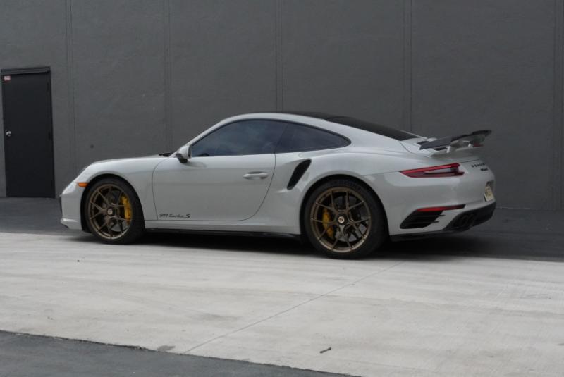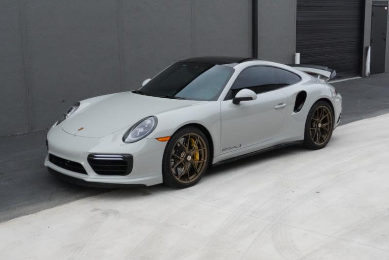 2018 Porsche 911 Turbo S, 991.2 in Chalk exterior with full front PPF over Black leather with Chalk extended deviated stitching. This Turbo S is well optioned with Carbon ceramic brakes with yellow calipers, carbon fiber interior trim, adaptive cruise control, LED headlights in Black with PLDS, 18-way adaptive front sport seats, Burmeister Surround Sound System, pedals and footrest in aluminum, rear center tunnel cover in leather, Porsche Entry and Drive, and Electric Slide and tilt sunroof. Further enhancements have been added to the car with Moshammer side skirts and rear wing, BBS FI-R EVO center lock wheels in Matte Metallic Bronze wrapped in like new Michelin Pilot Sport 4 S tires, Fabspeed Valvetronic Super Sport X-Pipe exhaust with remote and black tips (sport cat version) and hardwired for radar detection.