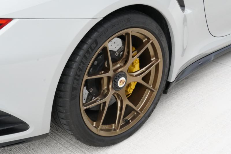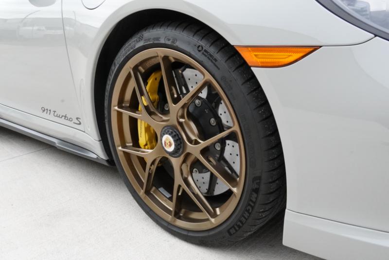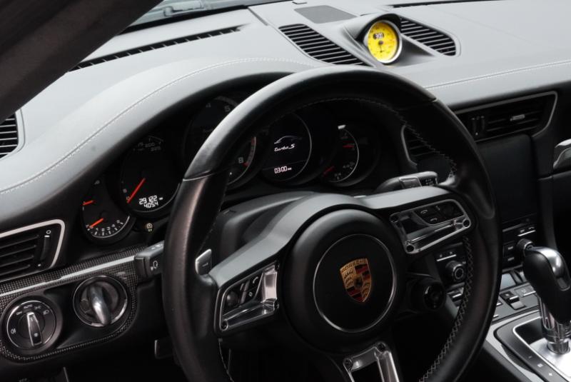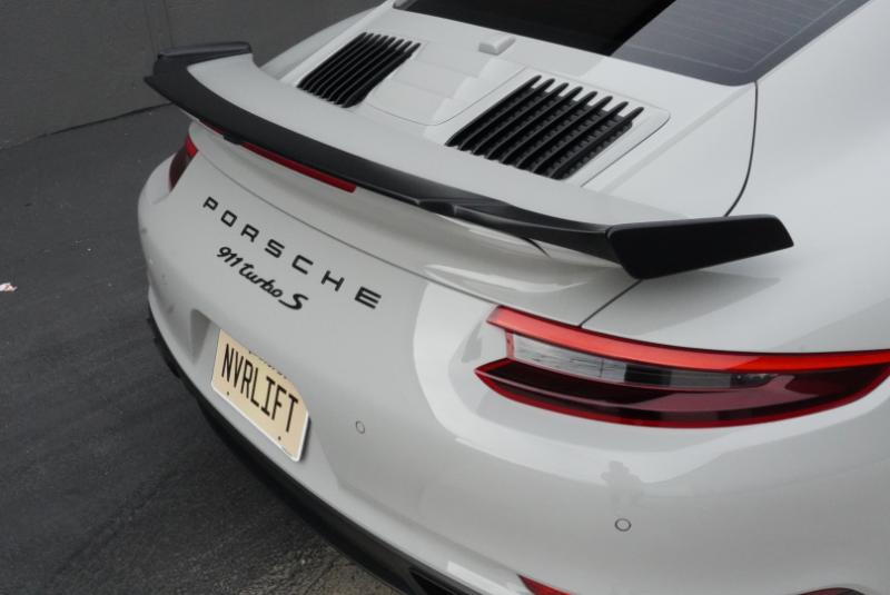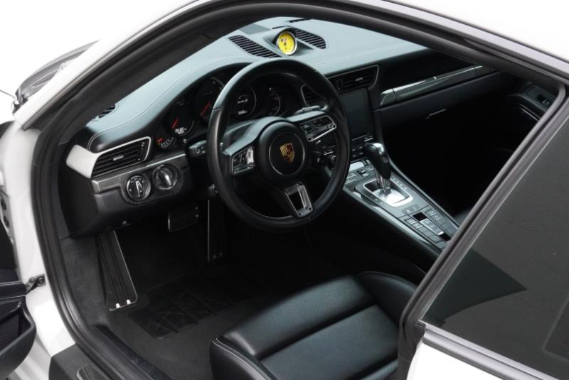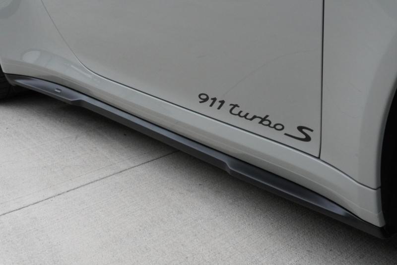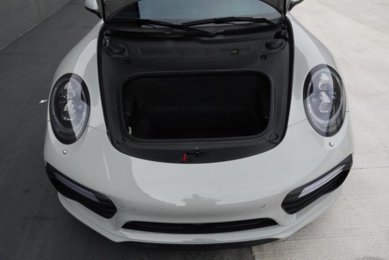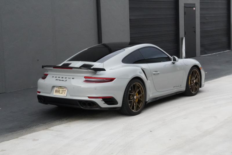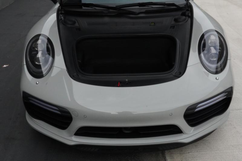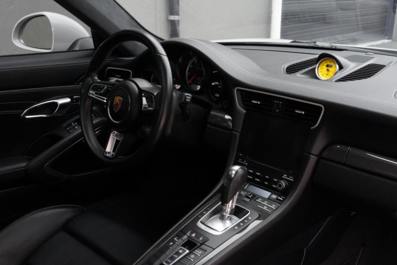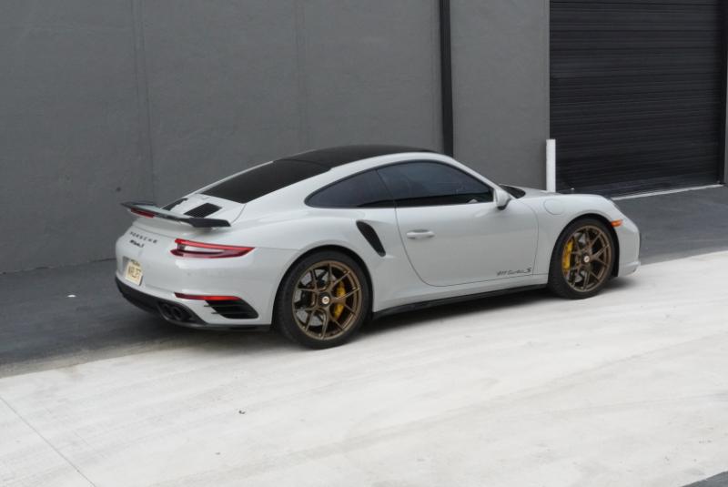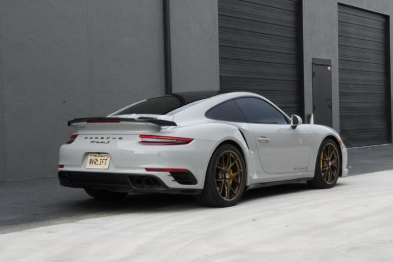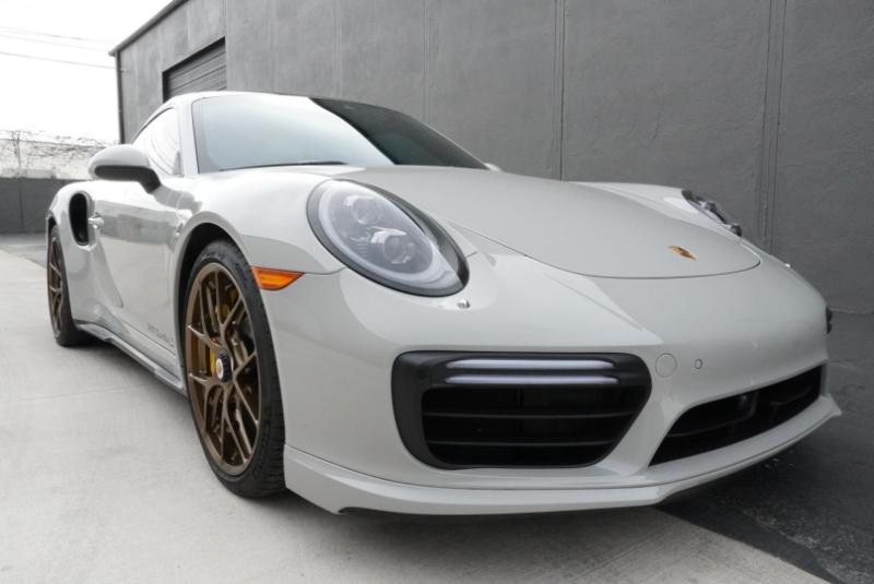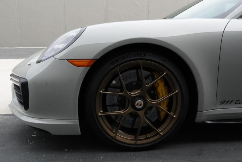 2018 Porsche 911 Turbo S, 991.2 in Chalk exterior with full front PPF over Black leather with Chalk extended deviated stitching. This Turbo S is well optioned with Carbon ceramic brakes with yellow calipers, carbon fiber interior trim, adaptive cruise control, LED headlights in Black with PLDS, 18-way adaptive front sport seats, Burmeister Surround Sound System, pedals and footrest in aluminum, rear center tunnel cover in leather, Porsche Entry and Drive, and Electric Slide and tilt sunroof. Further enhancements have been added to the car with Moshammer side skirts and rear wing, BBS FI-R EVO center lock wheels in Matte Metallic Bronze wrapped in like new Michelin Pilot Sport 4 S tires, Fabspeed Valvetronic Super Sport X-Pipe exhaust with remote and black tips (sport cat version) and hardwired for radar detection.