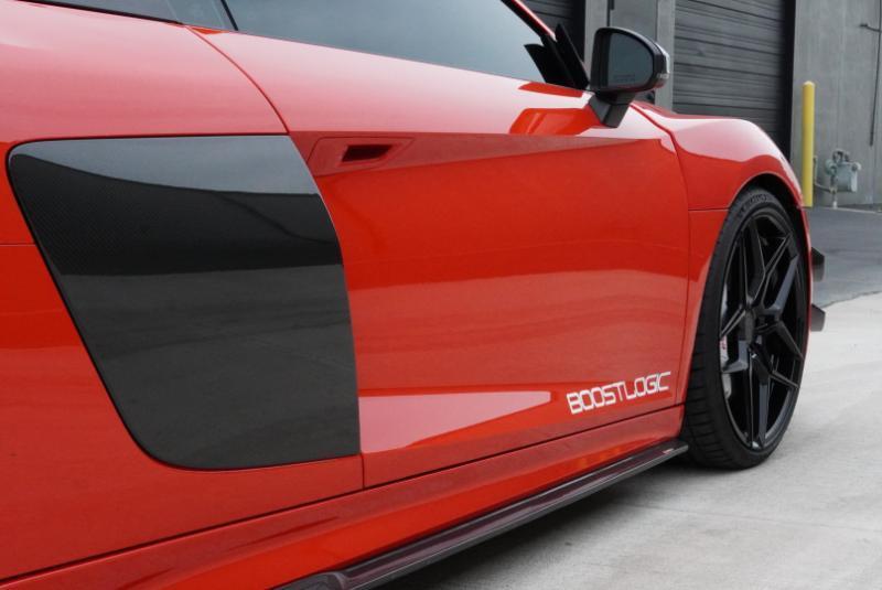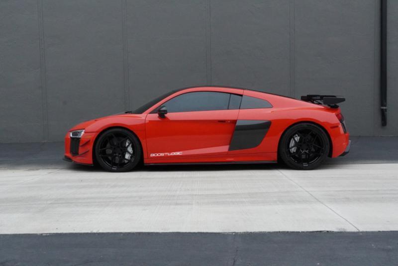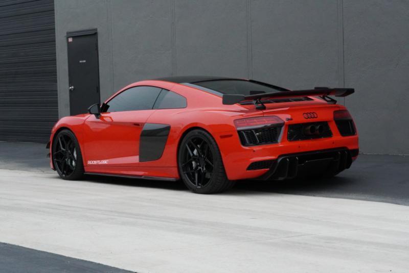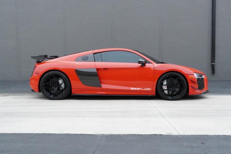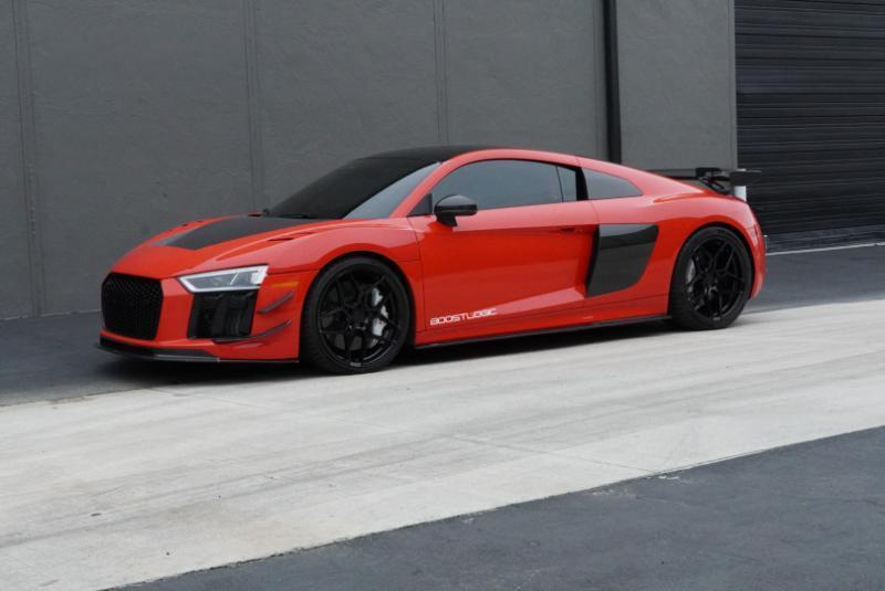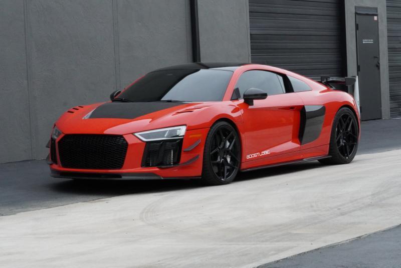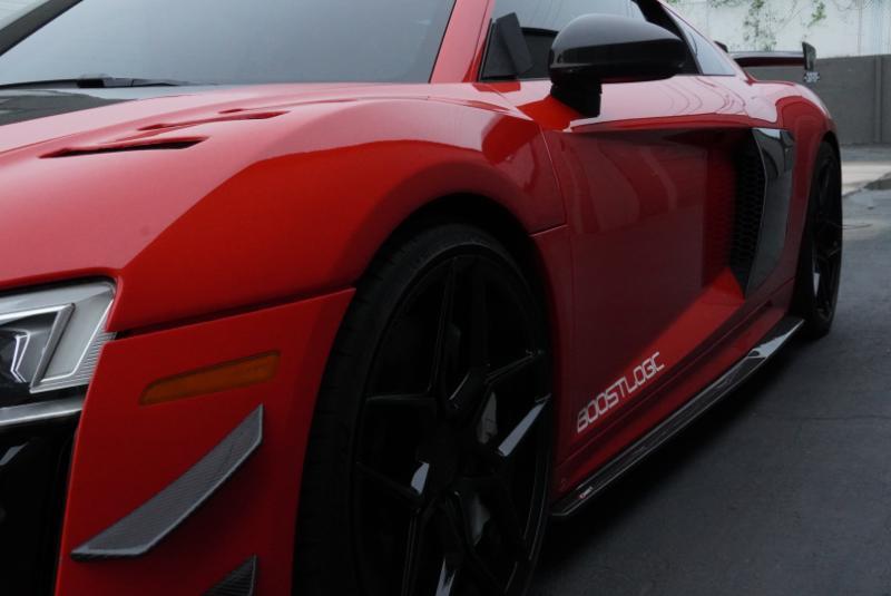 Boost Logic Twin Turbo 2017 Audi R8 V10 Plus, 43k miles with 8k miles on the Boost Logic Twin Turbo build. Dynamite Red over black leather with red diamond stitched seats, full paint protection film. Recent $20k upgrade to dual Motec 142's. Paint matched Garrett GTX3582 66mm Turbos currently running 8 lbs. of boost and good for 862 whp on the current 91 Octane tune with 2" titanium waste gates and custom titanium exhaust. Carbon Fiber everywhere including Vorsteiner front lip and rear splitter, CMST side skirts, 1016 full carbon hood, Autobahn sport wing, and full carbon engine compartment. Carbon brakes with white calipers behind 20" Rohana wheels with new Michelin PS4's. Interior is diamond stitched black leather with contrast red stitching, alcantara diamond stitched headliner, B&O Sound System, Dynamic Steering, Forged Carbon Fiber steering wheel, paint matched Boost Logic Roll Cage.