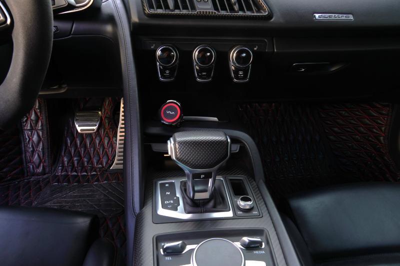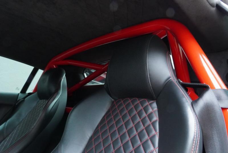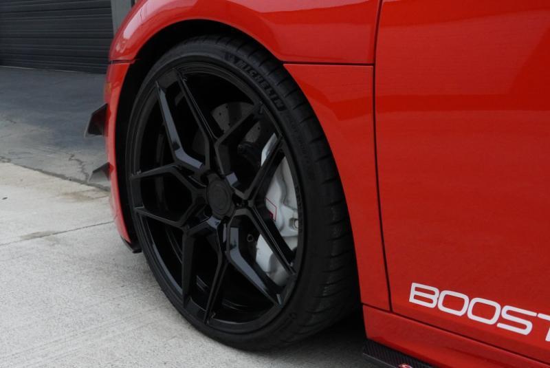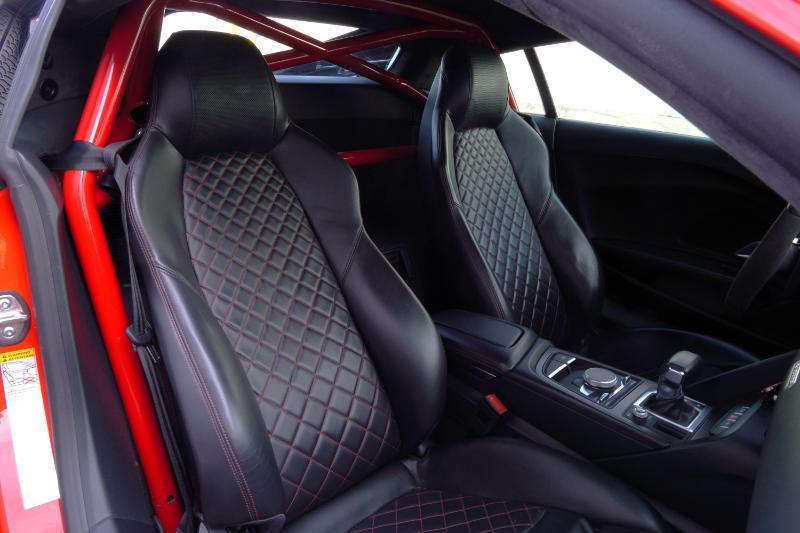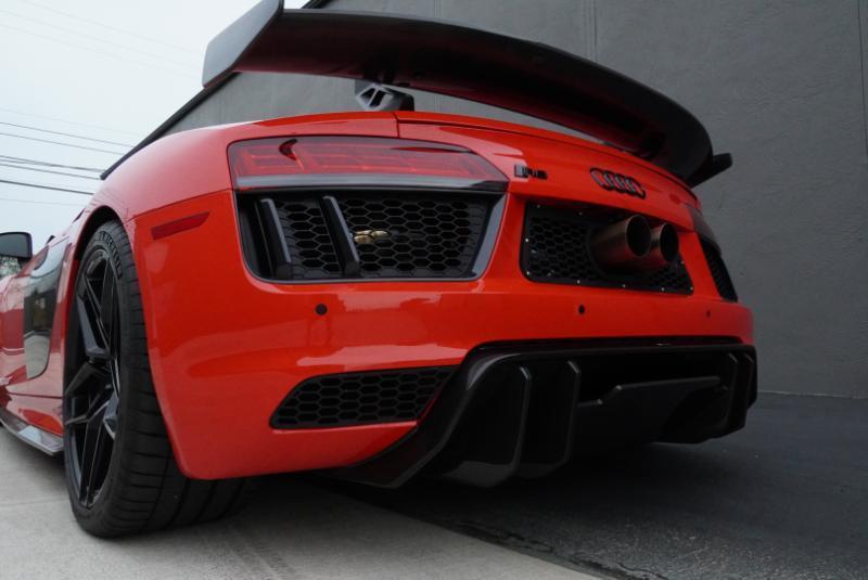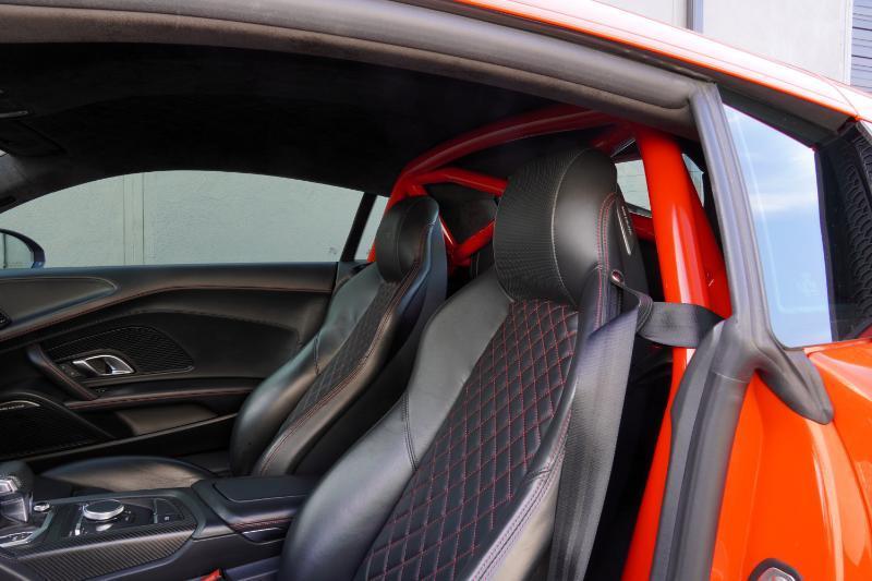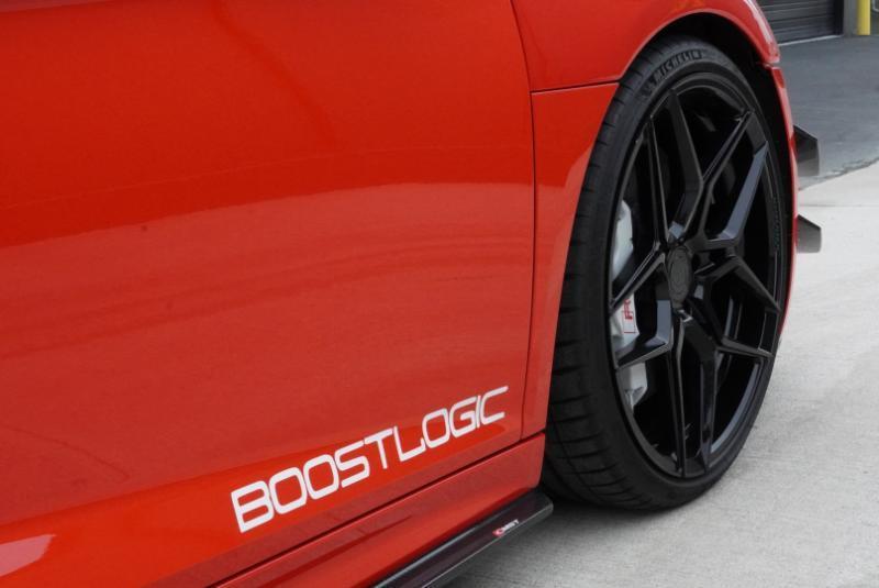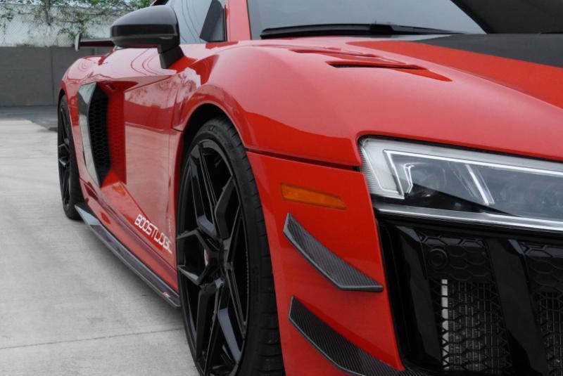 Boost Logic Twin Turbo 2017 Audi R8 V10 Plus, 43k miles with 8k miles on the Boost Logic Twin Turbo build. Dynamite Red over black leather with red diamond stitched seats, full paint protection film. Recent $20k upgrade to dual Motec 142's. Paint matched Garrett GTX3582 66mm Turbos currently running 8 lbs. of boost and good for 862 whp on the current 91 Octane tune with 2" titanium waste gates and custom titanium exhaust. Carbon Fiber everywhere including Vorsteiner front lip and rear splitter, CMST side skirts, 1016 full carbon hood, Autobahn sport wing, and full carbon engine compartment. Carbon brakes with white calipers behind 20" Rohana wheels with new Michelin PS4's. Interior is diamond stitched black leather with contrast red stitching, alcantara diamond stitched headliner, B&O Sound System, Dynamic Steering, Forged Carbon Fiber steering wheel, paint matched Boost Logic Roll Cage.